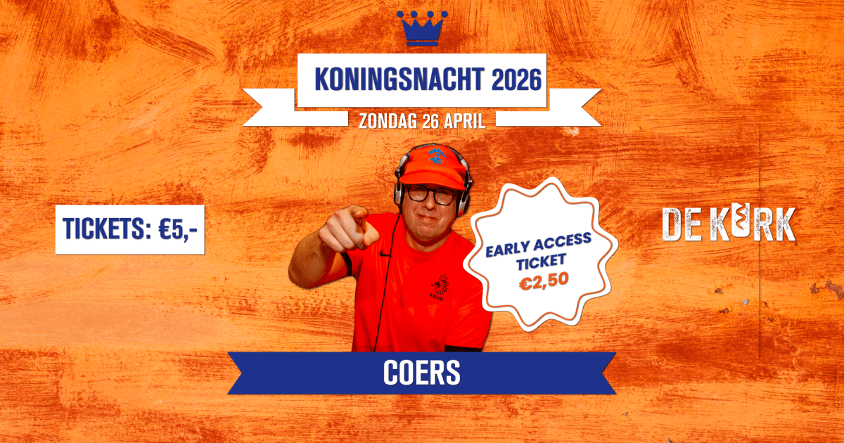 Voor Koningsnacht scoor je extra voordelig een Early Access-ticket (€2,50 i.p.v. €5,-). Let op: met dit ticket moet je vóór 24.00 uur binnen zijn in de Kurk. Deuren openen om 23.00 uur.